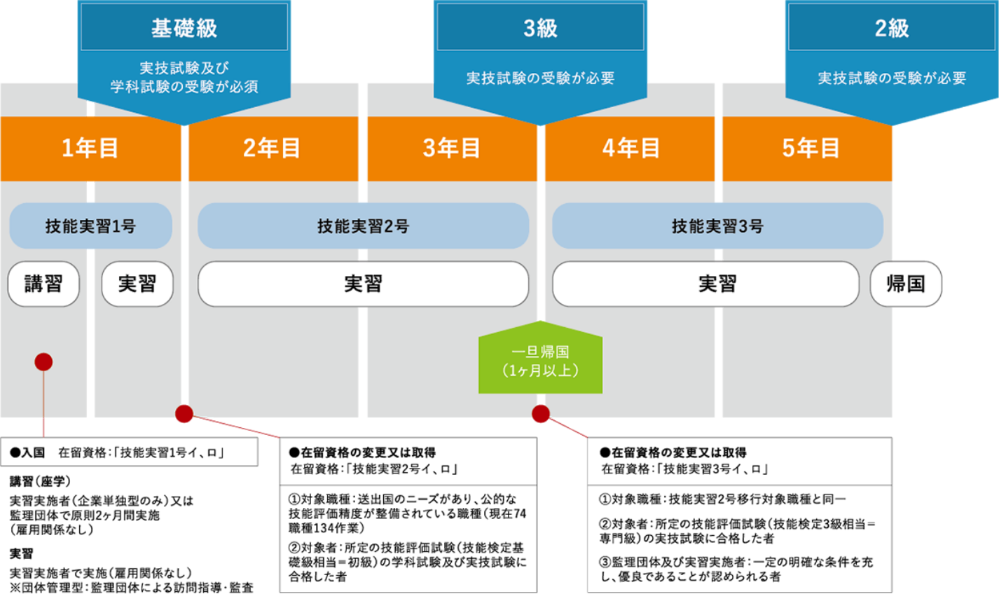 実習職種、作業の技能検定試験、技能評価試験等に合格すれば、最長で5年間まで “ 在留 ” を延長する事ができます。